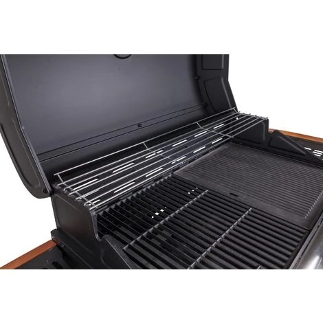 Il barbecue a gas CONTROL 4 ha una struttura realizzata in metallo e in legno. Il colore dominante è il nero, è composto da 4 bruciatori in acciaio inox dalla potenza di 3,5kW ciascuno. La griglia di cottura e la piastra sono prodotte in ghisa, coprono un’area di cottura dalla misura di 74x41cm. Il coperchio frontale a scorrimento è in acciaio e ha integrato un termometro, strumento utile per il monitoraggio della temperatura interna. Al di sotto è presente un piano in legno a effetto doghe che può servire come appoggio per i vari accessori. È munito di: ganci per utensili, due ruote in plastica per facilitarne lo spostamento e di due ripiani laterali.