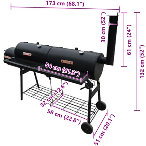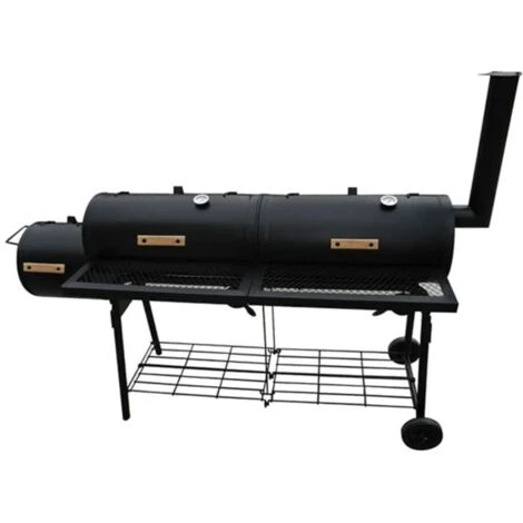 L’affumicatore ha due vani della griglia molto spaziosi. Un misuratore di temperatura consente di monitorare la temperatura all’interno dell’affumicatore. Un fondo aggiuntivo per riporre un po’ di legna in più può essere trovato nella parte inferiore.