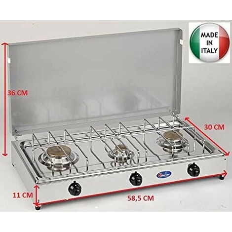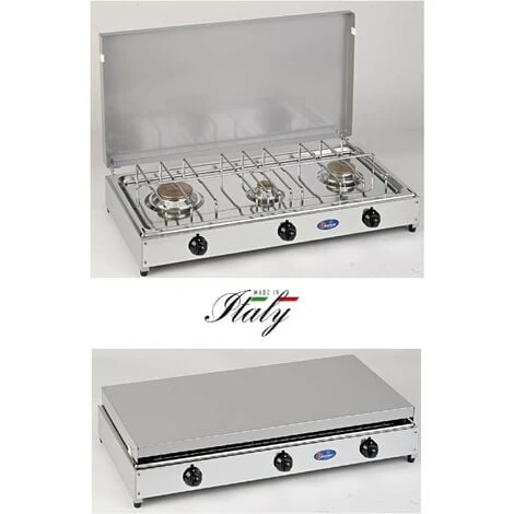 Fornello a gas a 3 fuochi, con piano in acciaio inox, coperchio e fianchi verniciati grigi, bruciatori in lega Pyral N2, spartifiamma in ottone stampato, griglia in acciaio cromato. Dimensioni: cm 58 x 30 x 12 – Peso: kg. 4,4