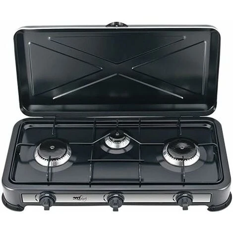 Fornello a gas 3 fuochi, base in alluminio con piedini in plastica, griglia removibile, regolazione della fiamma, funzionamento a gpl, solo per utilizzo esterno, colore nero.