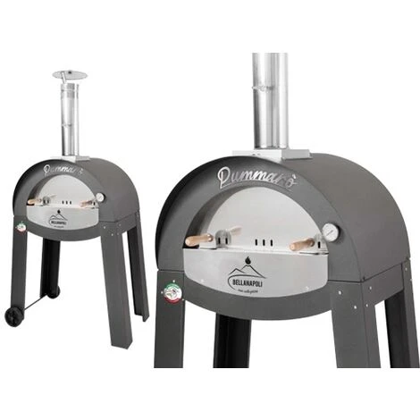 Forno a legna a cottura diretta da esterno. Camera di cottura 70×50 cm. in acciaio inox con base in pianelle refrattarie da 3 cm. certificate per uso alimentare. Sotto la pietra refrattaria posta una lastra di scamotek da 2,5 cm. (un materiale di silicato di calcio che permette un isolamento maggiore) Isolamento con lana di roccia di 8 cm. tra il tetto e camera di cottura. Comignolo inox, termostato, sportello chiusura bocca forno in acciaio, braciere interno porta legna, gambe di appoggio smontabili con 2 ruote. Ingombro 90x84xH184 cm. – Comignolo 10 cm. Peso 100 Kg. Ideale per 2 pizze