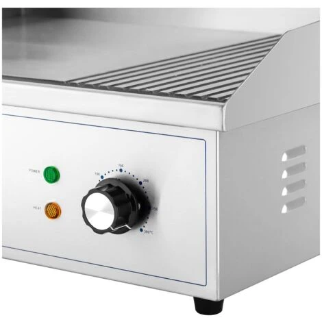 Il termostato completamente automatico assicura che la temperatura venga mantenuta costante. Grazie ai potenti elementi riscaldanti, che lavorano con 3.000 W, la griglia fry top raggiunge una temperatura di funzionamento di 50 – 300 °C, che può essere impostata tramite la manopola.