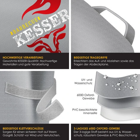 Ancora una volta, la qualitàKESSERsi fa notareperuna lavorazione dei materiali di altissima qualità. Due maniglie integrate su entrambi i lati lo rendono più facile da mettere e togliere, e pertrasportare la copertura. In soli pochi secondi il vostro barbecue è pronto per l’uso e la fastidiosa conservazione del barbecue dopo l’uso è da ora in poi storia vecchia. Il barbecue non è mai stato così conveniente!