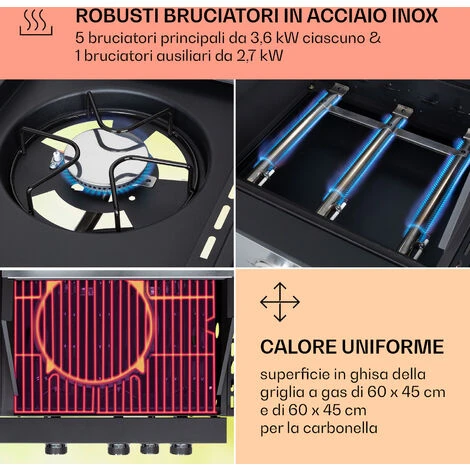 Massima potenza: cinque bruciatori principali con 3,6 kW ciascuno e un bruciatore ausiliario in acciaio inox con 2,7 kW di potenza