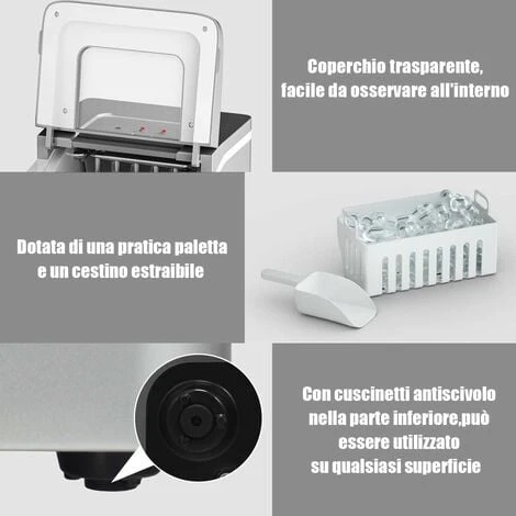Prepara rapidamente cubetti di ghiaccio: Questo efficiente fabbricatore di ghiaccio può produrre 12 kg di cubetti di ghiaccio in un giorno, così puoi goderti acqua o bevande ghiacciate in qualsiasi momento! Può produrre cubetti di ghiaccio a forma di proiettile ogni otto minuti, in grado di soddisfare le tue esigenze quotidiane.