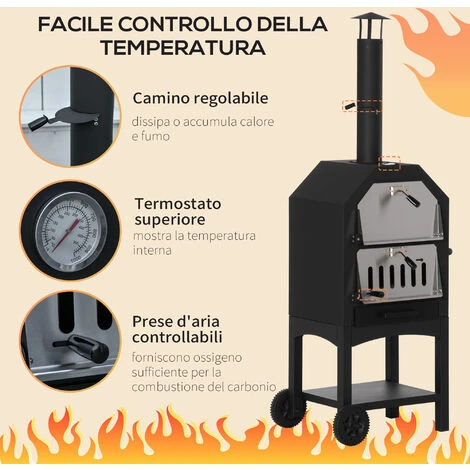 Questo forno per la pizza Outsunny è l’accessorio perfetto per stupire i tuoi ospiti e fare cene indimenticabili! Progettato per ambienti esterni, è dotato di una ciminiera lunga, un termometro per il controllo della temperatura, un ripiano inferiore e 2 ruote per muoverlo facilmente da una parte all’altra del giardino. Cosa aspetti, trasforma il modo di vivere i barbecue all’aria aperta con questo incredibile forno a carbonella!