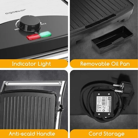 - Il design della superficie inclinata della piastra inferiore può filtrare l’olio in eccesso e rendere il cibo più sano. Il grande vassoio di raccolta dell’olio è comodo per raccogliere grasso e residui solidi.