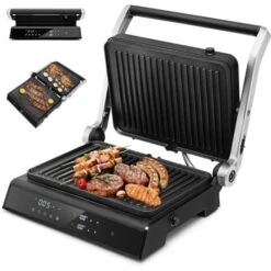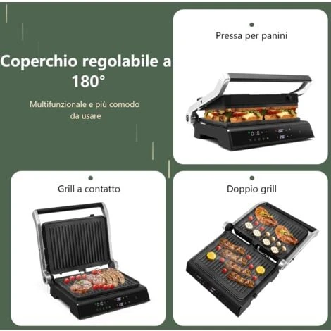 - ★Pannello di Controllo Touchscreen★ Bistecchiera domestica con potenza di 2000 W, dotato di un tubo di riscaldamento in acciaio inox, timer 1min – 4H, spia in funzione e segnale acustico fine cottura. 5 modalità di cottura per sandwich, panini, bistecche, verdure e altro ancora.