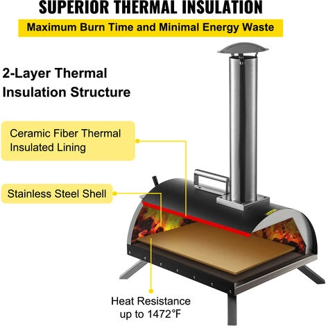Il guscio in acciaio inossidabile 430 del forno per pizza e il cotone isolante interno possono fornire un sistema di isolamento ultra-alto. La pietra per pizza in cordierite può resistere ad alte temperature fino a 1472°F, rendendo l’interno della crosta della pizza più soffice.