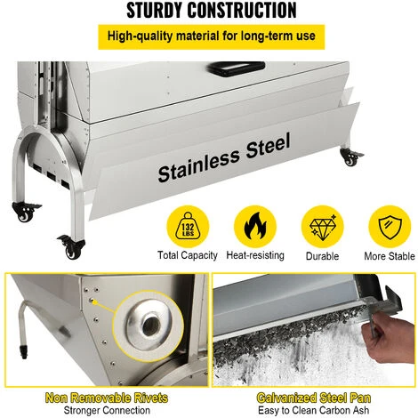 - Materiale Solido & Robusto: il girarrosto per agnello è realizzato in acciaio inossidabile resistente e di alta qualità, può resistere alle alte temperature ed è facile da mantenere e pulire. 3 griglie in acciaio inox consentono di cuocere meglio i cibi. Capacità carico massima è di 60kg. Inoltre, il motore ad alta intensità aiuta a grigliare in modo più efficiente.